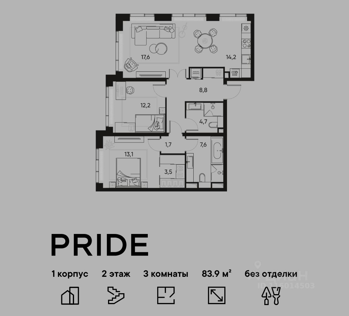 В премиальном жилом квартале PRIDE продается 3-комнатная квартира в 1 корпусе, на 2 этаже, в секции 6. Её общая площадь составляет 83.9 м². Пространство включает 2 уютные спальни 12,2 м², 13,1 м², просторную кухню-гостиную 31,8 м² и 2 ванные комнаты 7,6 м² и 4,7 м².
