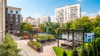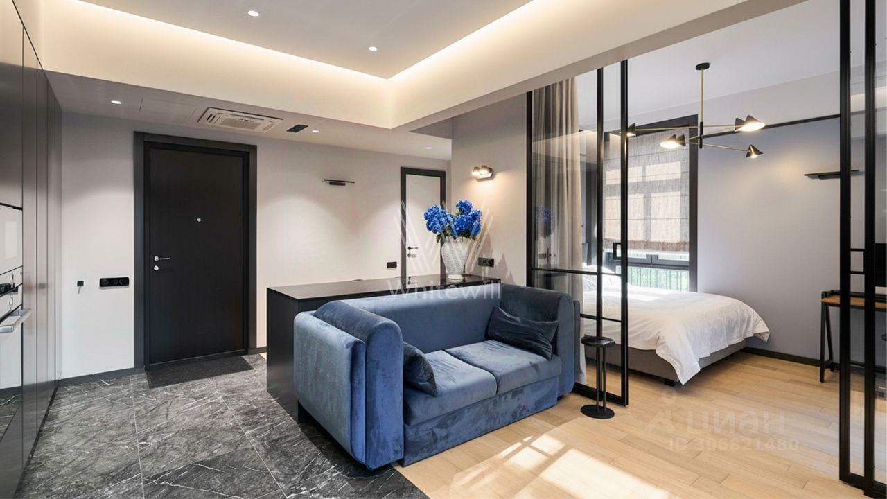 Апартаменты с одной спальней площадью 46 м² в клубном доме премиум-класса Sinatra. Жилой комплекс расположен в тихом центре Москвы, утопающем в зелени, пешком можно дойти до Патриарших прудов.