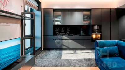 Апартаменты с отделкой расположены на третьем этаже. Выполнен дизайнерский ремонт в стиле минимализм в сдержанных серых оттенках с использованием премиальных материалов, техника от ведущих производителей — Bosch, Samsung. Планировкой предусмотрены кухня-гостиная, спальня с оборудованной рабочей зоной, санузел с душевой кабиной и постирочная. Окна ориентированы на две стороны, открываются панорамные виды на уютный зелёный внутренний двор и террасу.