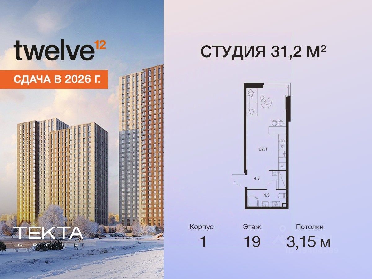 1-комн. квартира-студия в ЖК "Твелв" на 19 этаже в 34 этажном здании Корпус 1. Общая площадь: 31.2 кв.м., жилая: 14.20 кв.м. Высота потолков 3.15 м.