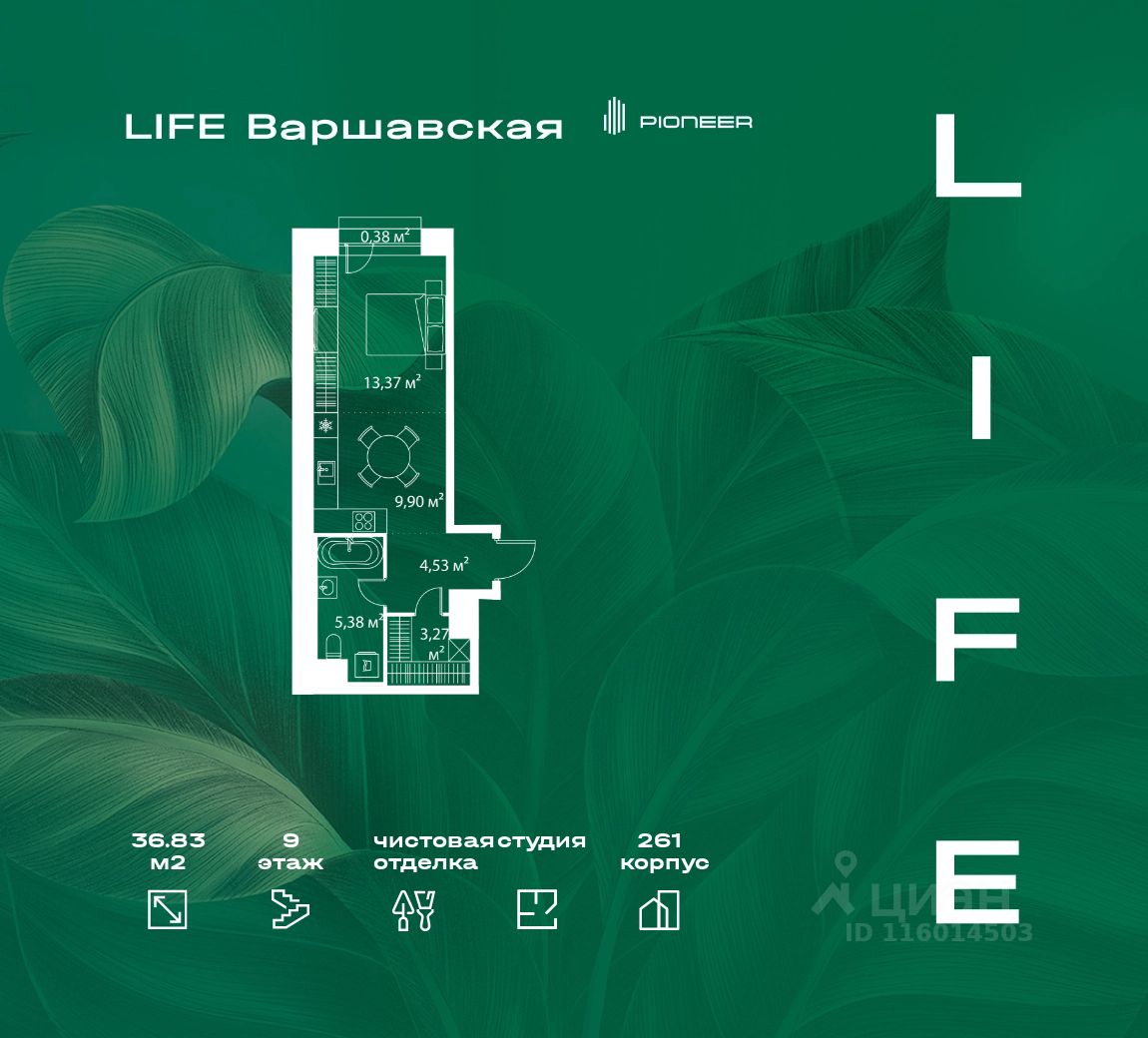 В районе Москворечье-Сабурово продается студия площадью 36.83 м². Она расположена на 9 этаже в 261 корпусе нового жилого квартала LIFE Варшавская.