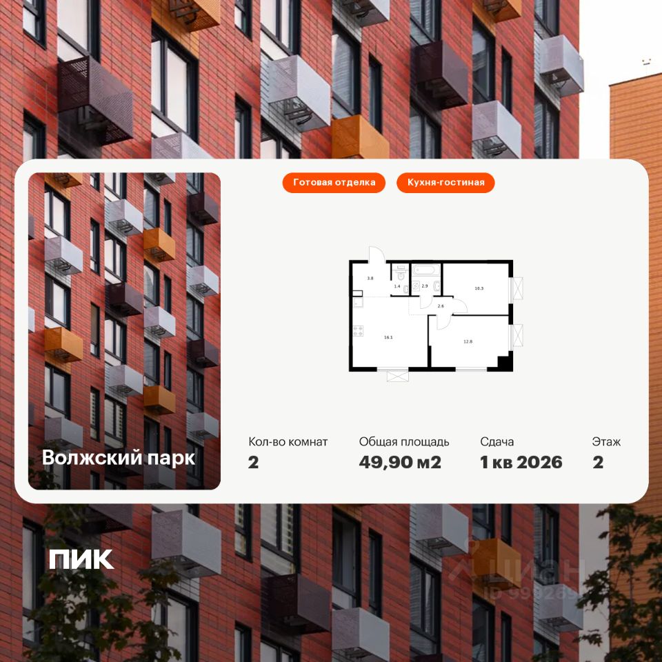 Продаётся 2-комн. квартира площадью 49,9 кв.м на 2 этаже 15 этажного дома (Корпус 6.1, Секция 2) проекта ПИК Волжский парк. Светлый просторный подъезд на уровне земли, функциональная планировка, большие окна, c отделкой.