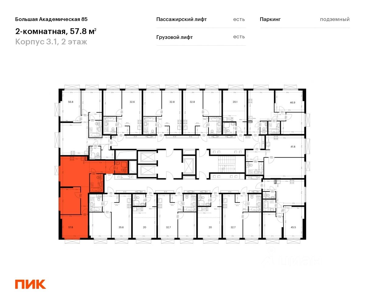 Продаётся 2-комн. квартира площадью 57,8 кв.м на 2 этаже 19 этажного дома (Корпус 3.1, Секция 1) проекта ПИК Большая Академическая 85. Светлый просторный подъезд на уровне земли, функциональная планировка, большие окна, c отделкой.