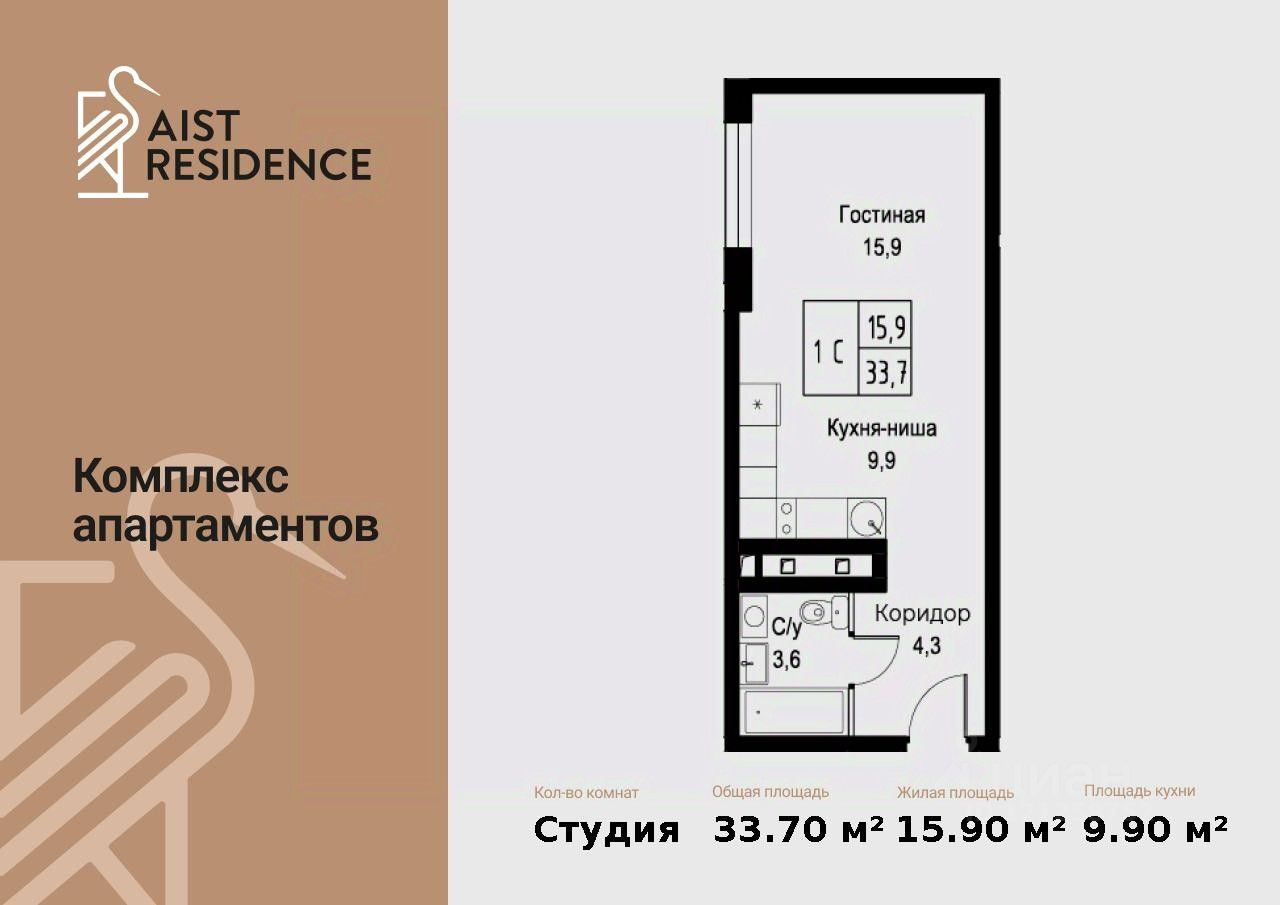 Продается студия площадью 33.70 кв.м. на 9-м этаже