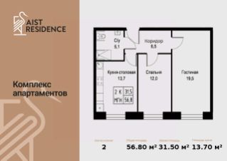 Продаются 2-к апартаменты площадью 56.80 кв.м. на 13-м этаже