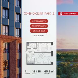 Продается 1-к квартира 45,9 кв.м. в ЖК "Семеновский парк 2" на 14-м этаже 18 этажного дома.
