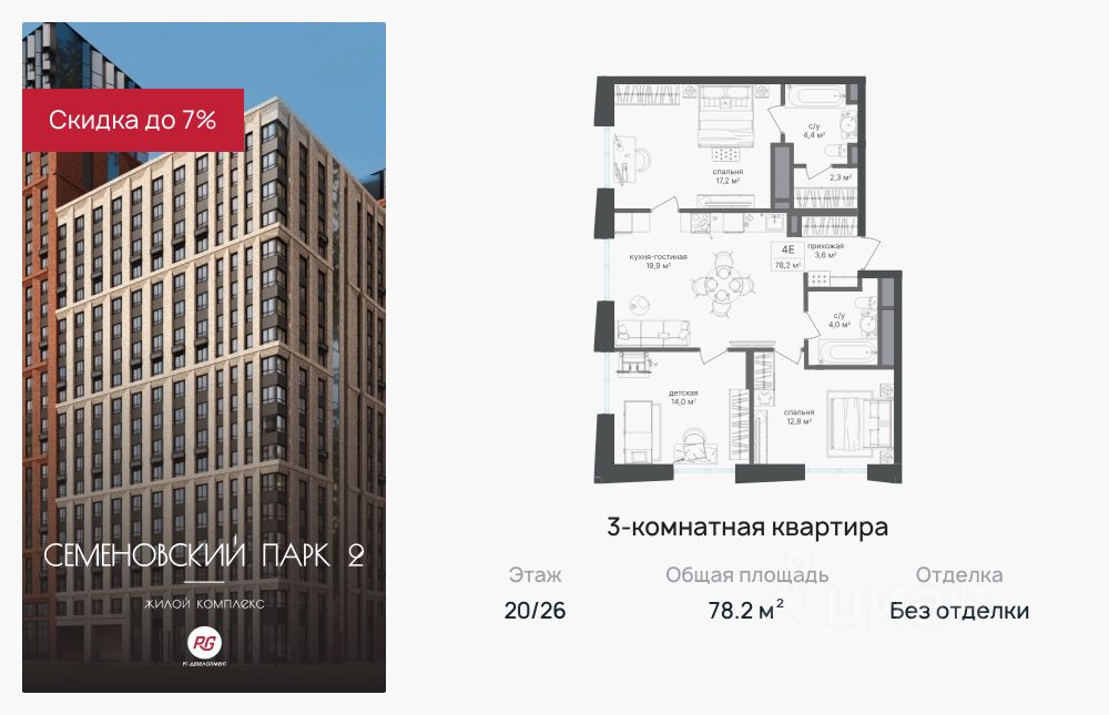 Продается 3-к квартира 78,2 кв.м. в ЖК "Семеновский парк 2" на 20-м этаже 26 этажного дома.