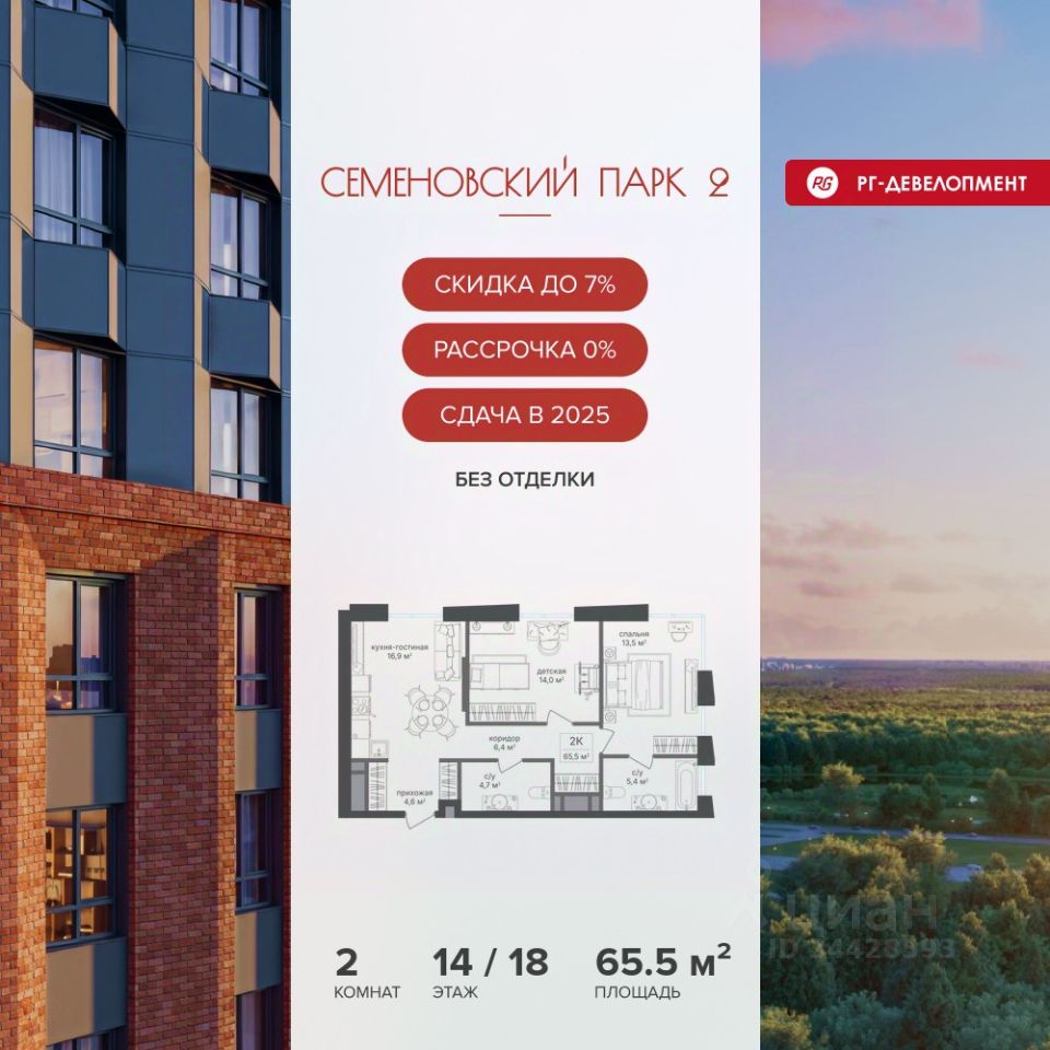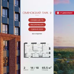 Продается 2-к квартира 65,5 кв.м. в ЖК "Семеновский парк 2" на 14-м этаже 18 этажного дома.