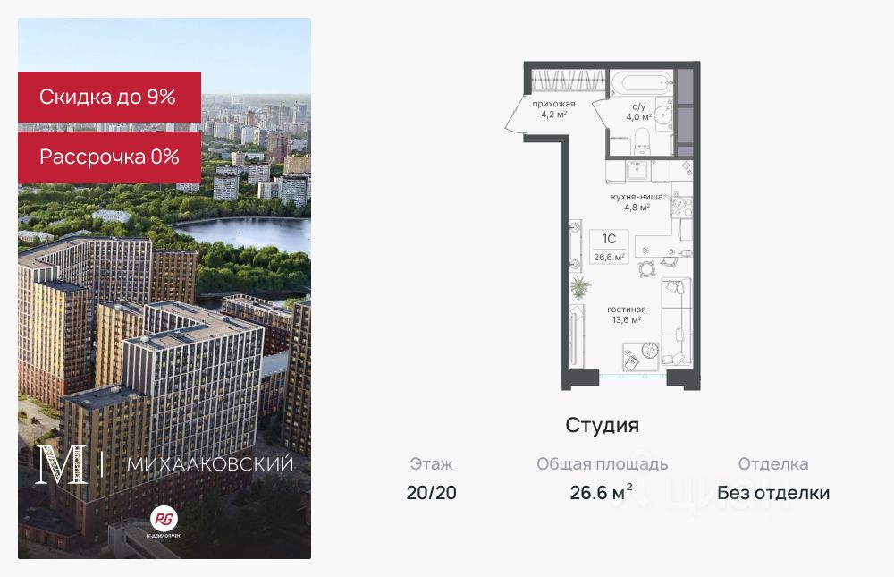 Продаётся студия 26,6 кв.м. в ЖК "Михалковский" на 20-м этаже 20 этажного дома.