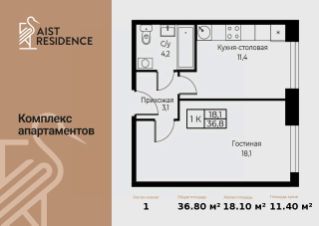 Продаются 1-к апартаменты площадью 36.80 кв.м. на 11-м этаже