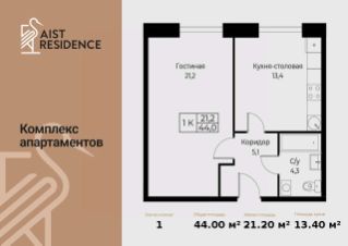 Продаются 1-к апартаменты площадью 44.00 кв.м. на 26-м этаже
