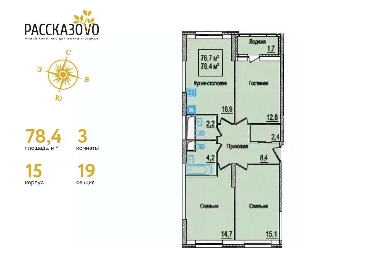 Продается 3-комнатная квартира в ЖК Рассказово на 12 этаже. Общая площадь квартиры составляет 78,9 кв.м. Квартира без отделки.