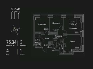 Продается 3-комнатная квартира в ЖК SEZAR CITY на 14 этаже. Общая площадь квартиры составляет 75,34 кв.м. Квартира без отделки. Срок сдачи — 2027 год.