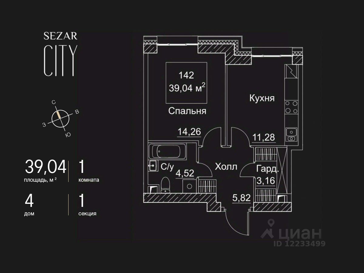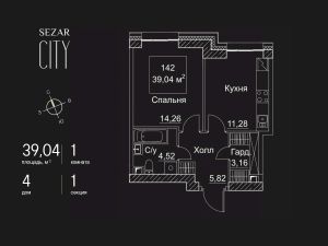 Продается 1-комнатная квартира в ЖК SEZAR CITY на 14 этаже. Общая площадь квартиры составляет 39,04 кв.м. Квартира без отделки. Срок сдачи - 2027 год.