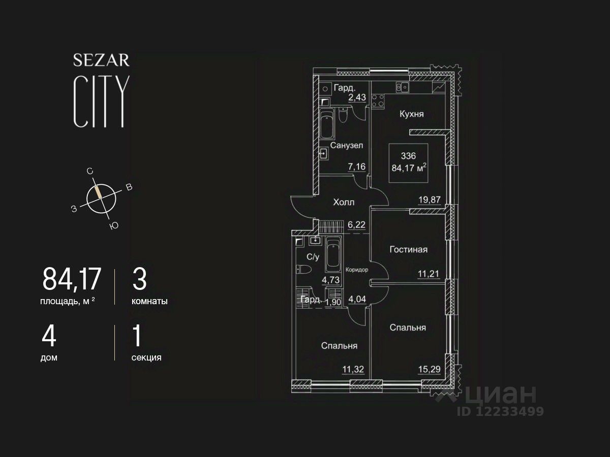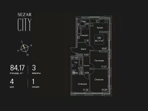 Продается 3-комнатная квартира в ЖК SEZAR CITY на 33 этаже. Общая площадь квартиры составляет 84,17 кв.м. Квартира без отделки. Срок сдачи - 2027 год.