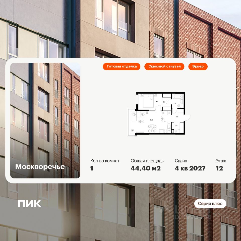 Продаётся 1-комн. квартира площадью 44,4 кв.м на 12 этаже 17 этажного дома (Корпус 1.2, Секция 3) проекта ПИК Москворечье. Светлый просторный подъезд на уровне земли, функциональная планировка, большие окна, c отделкой.