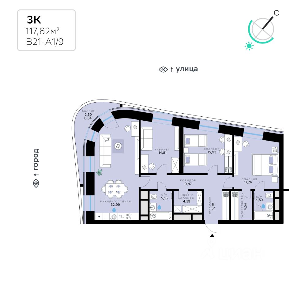 В продаже — трехкомнатная квартира с чистовой отделкой, общей площадью 117,62 кв. м. Квартира расположена на третьем этаже одинадцатиэтажной секции корпуса класса Адвансд в новом районе СберСити, который строит Сбер. Дом находится на второй береговой линии Москвы-реки.