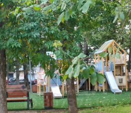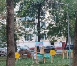 Кирпичный дом, хороший подъезд, роскошный зеленый двор, в котором есть своя парковка.