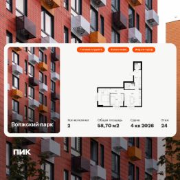 Продаётся 2-комн. квартира площадью 58,7 кв.м на 24 этаже 24 этажного дома (Корпус 6.2, Секция 1) проекта ПИК Волжский парк. Светлый просторный подъезд на уровне земли, функциональная планировка, большие окна, c отделкой.