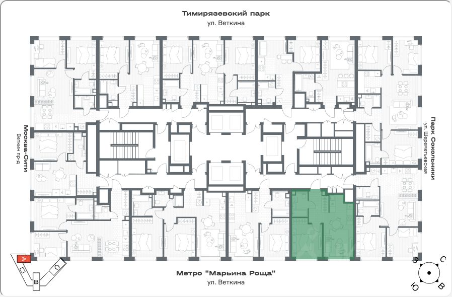 Проект расположен на границе с ЦАО в районе Марьина Роща на улице Веткина. В шаговой доступности находится метро Марьина роща (5 минут), парки "Останкино" и "Сокольники" (15 минут). До центра столицы время в пути составит 15 минут на авто.