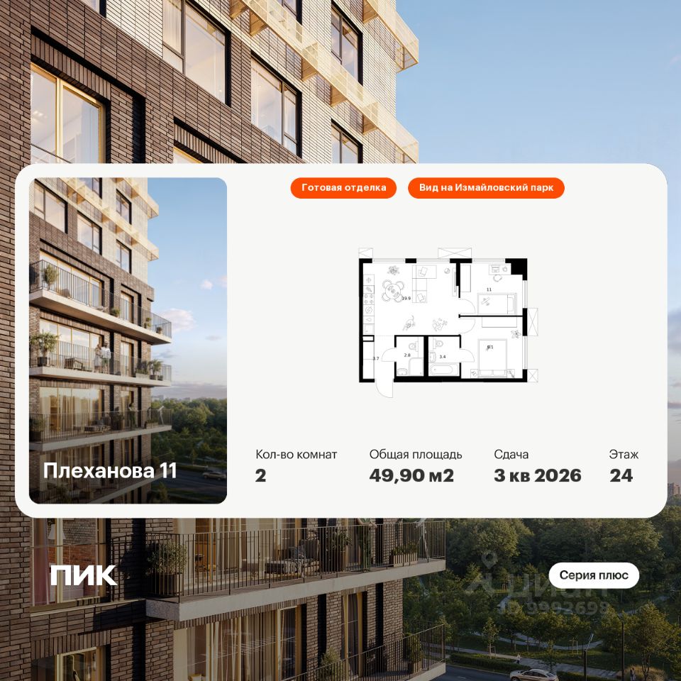 Продаётся 2-комн. квартира площадью 49,9 кв.м на 24 этаже 24 этажного дома (Корпус 1.4, Секция 4) проекта ПИК Плеханова 11. Светлый просторный подъезд на уровне земли, функциональная планировка, большие окна, c отделкой.