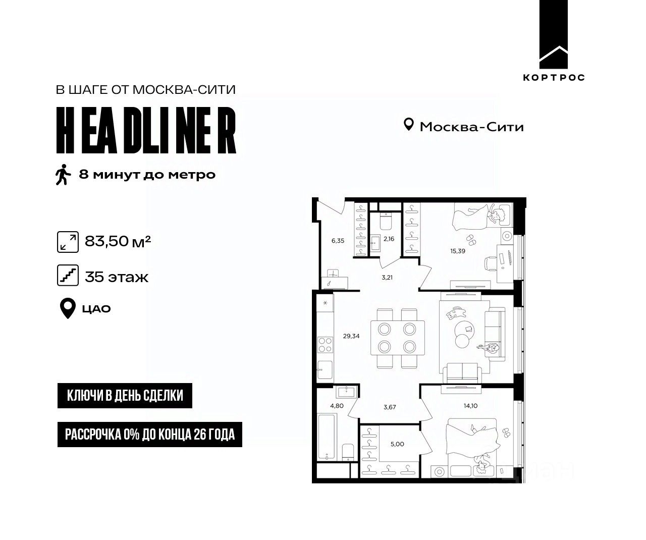 Продаётся 2-комнатная квартира евроформата в ЖК HEADLINER, общей площадью 82,81 кв.м., на 35 этаже, Без отделки. Высота потолков 3 м.