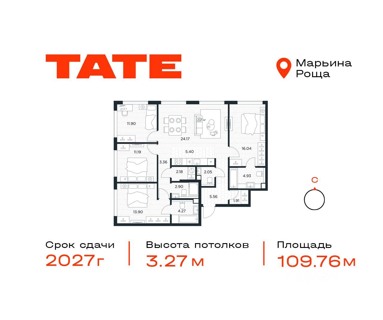 Продаётся 4-комнатная квартира от застройщика в ЖК премиум-класса TATE на 27 этаже. Общая площадь 109,76 м². Отделка предчистовая (white box). Башня В.