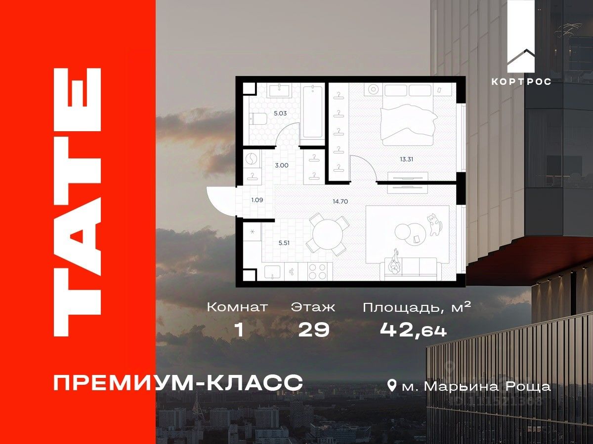 Продаётся 1-комнатная квартира от застройщика в ЖК премиум-класса TATE на 29 этаже. Общая площадь 42,64 м². Отделка предчистовая (white box). Башня В.