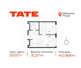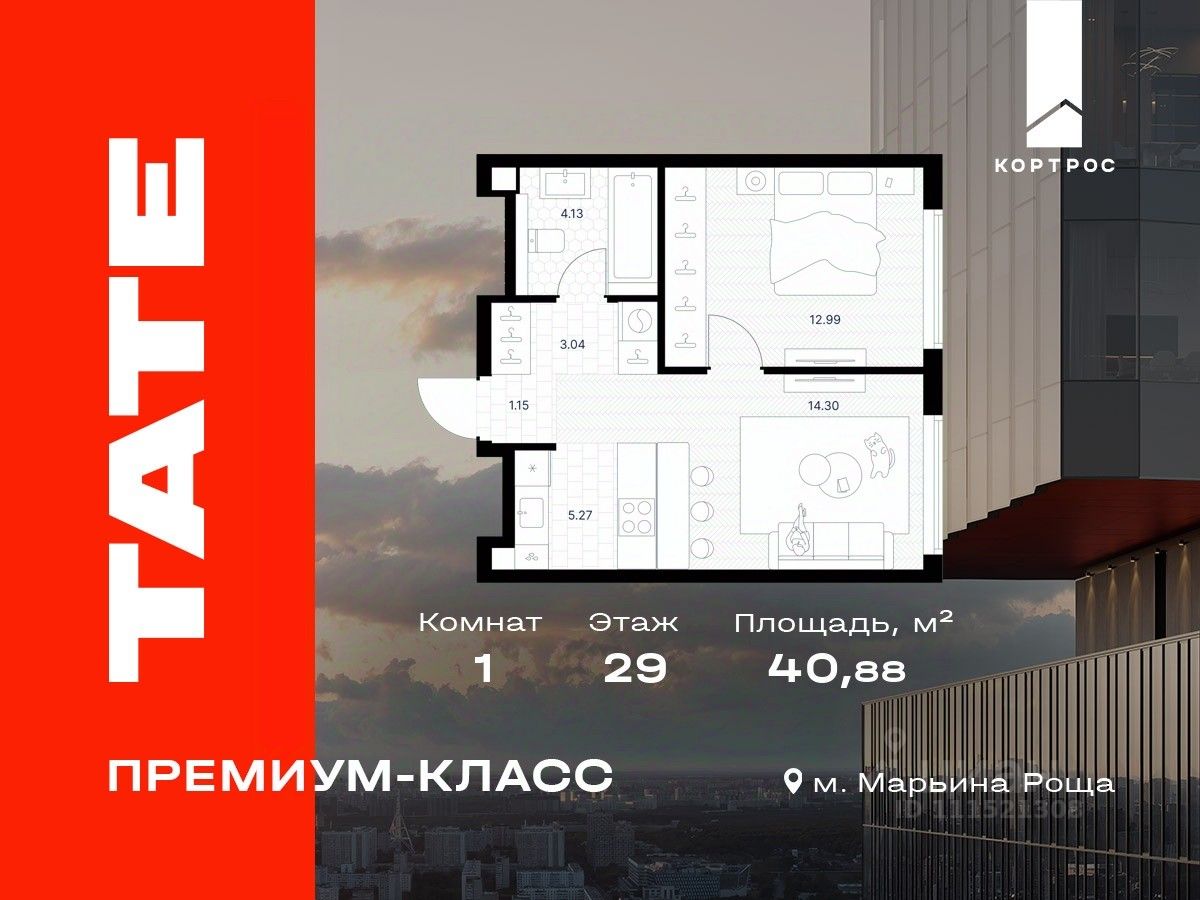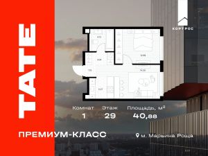 Продаётся 1-комнатная квартира от застройщика в ЖК премиум-класса TATE на 29 этаже. Общая площадь 40,88 м². Отделка предчистовая (white box). Башня В.