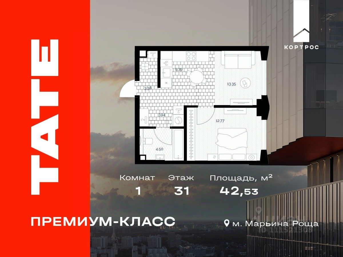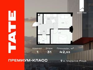 Продаётся 1-комнатная квартира от застройщика в ЖК премиум-класса TATE на 31 этаже. Общая площадь 42,53 м². Отделка предчистовая (white box). Башня В.