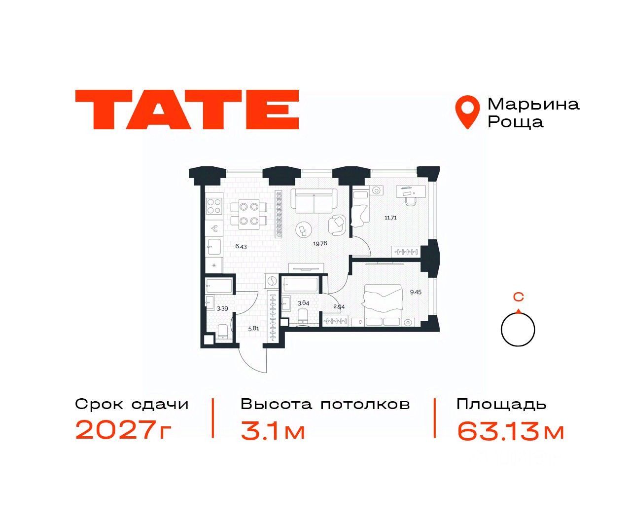 Продаётся 2-комнатная квартира от застройщика в ЖК премиум-класса TATE на 35 этаже. Общая площадь 63,13 м². Отделка предчистовая (white box). Башня В.