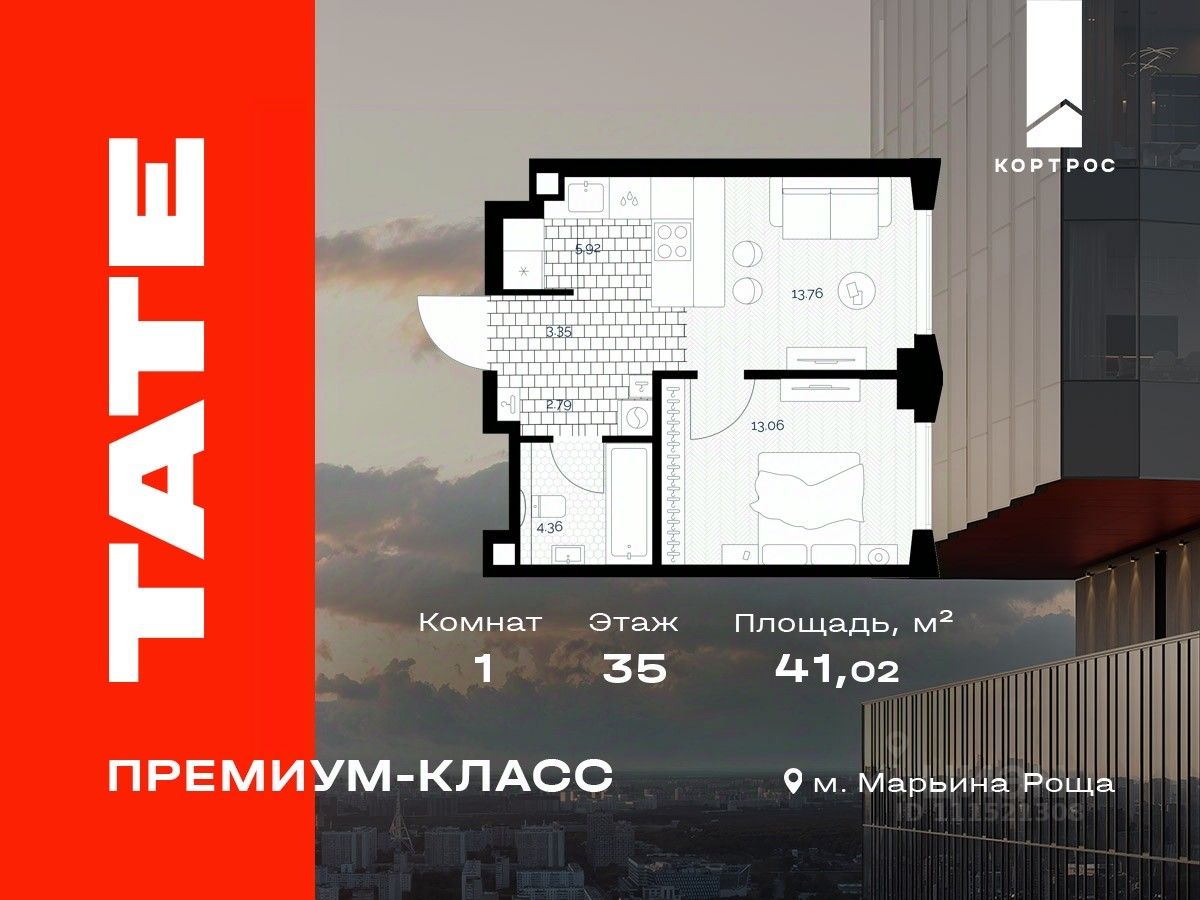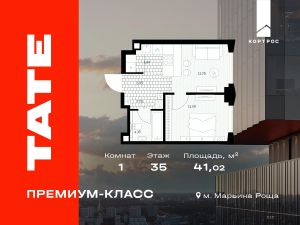 Продаётся 1-комнатная квартира от застройщика в ЖК премиум-класса TATE на 35 этаже. Общая площадь 41,02 м². Отделка предчистовая (white box). Башня В.