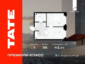 Продаётся 1-комнатная квартира от застройщика в ЖК премиум-класса TATE на 35 этаже. Общая площадь 42,44 м². Отделка предчистовая (white box). Башня В.