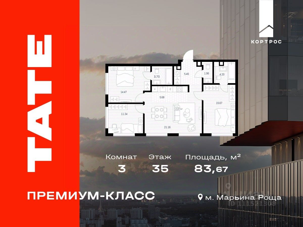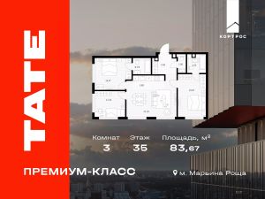 Продаётся 3-комнатная квартира от застройщика в ЖК премиум-класса TATE на 35 этаже. Общая площадь 83,67 м². Отделка предчистовая (white box). Башня В.