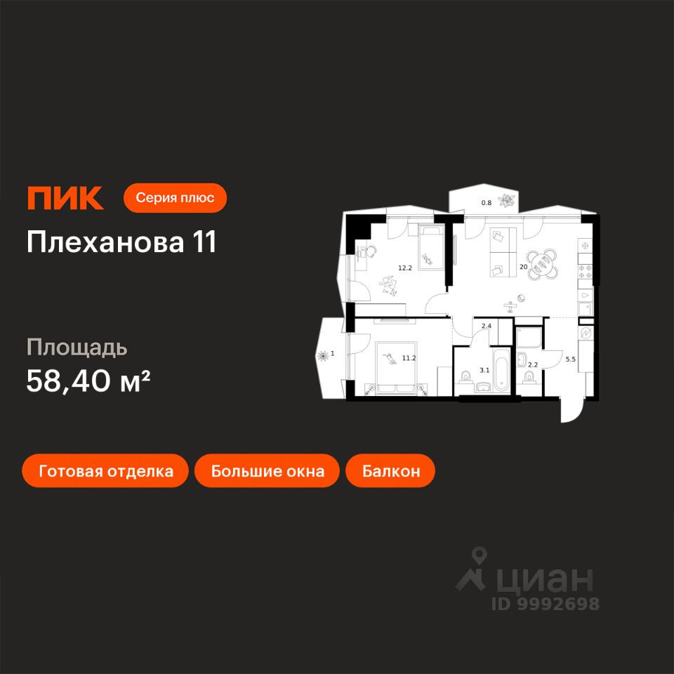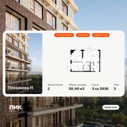 Продаётся 2-комн. квартира площадью 58,4 кв.м на 2 этаже 31 этажного дома (Корпус 1.5, Секция 5) проекта ПИК Плеханова 11. Светлый просторный подъезд на уровне земли, функциональная планировка, большие окна, c отделкой.