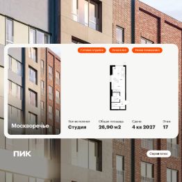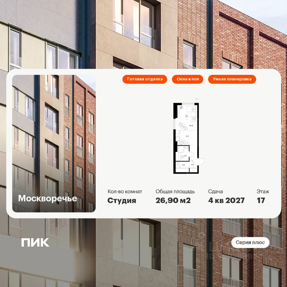 Продаётся квартира-студия площадью 26,9 кв.м на 17 этаже 17 этажного дома (Корпус 1.2, Секция 3) проекта ПИК Москворечье. Светлый просторный подъезд на уровне земли, функциональная планировка, большие окна, c отделкой.