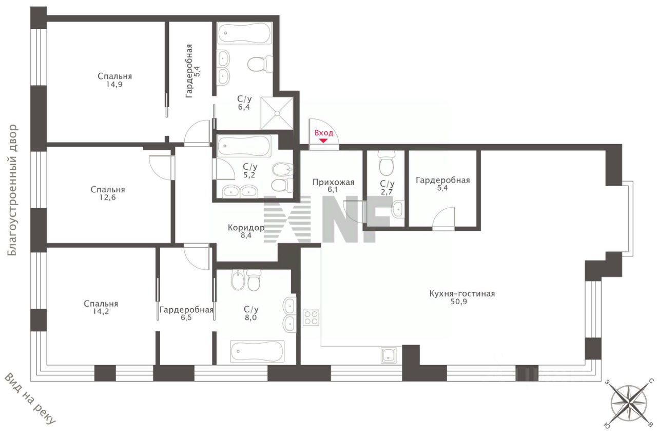 Планировка свободная, оптимальный вариант организации пространства: гостиная с зоной кухни, три спальни с собственными ванными и гардеробными, гостевой санузел.