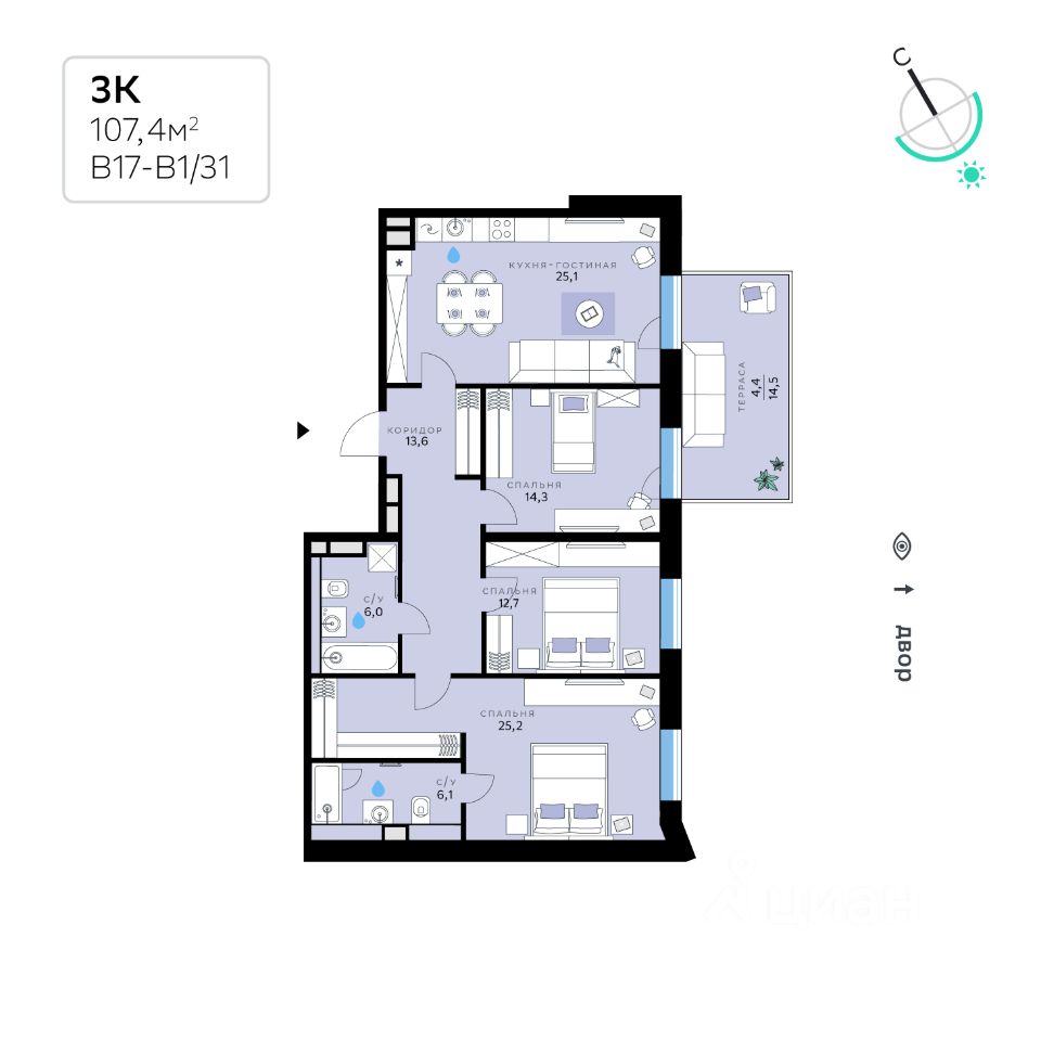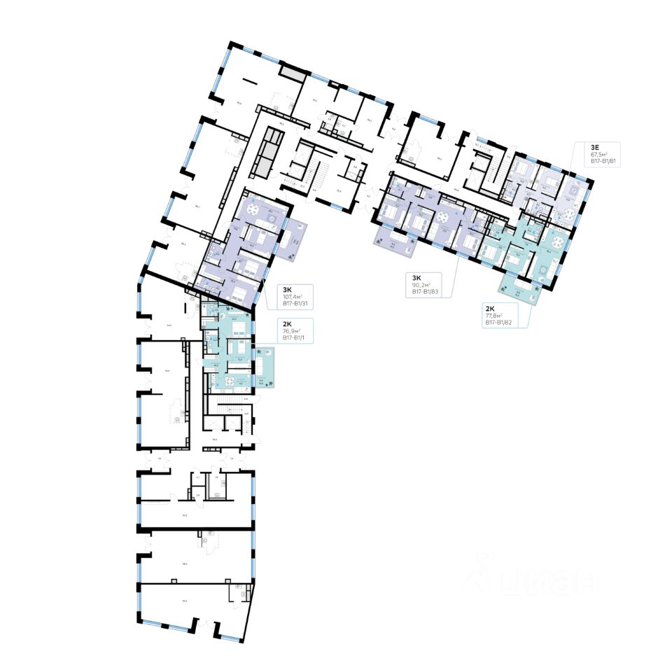 В продаже — трехкомнатная квартира с чистовой отделкой, общей площадью 107,4 кв. м. Квартира расположена на первом этаже шестиэтажного корпуса класса Балансд в квартале В17 нового района СберСити, который строит Сбер. Всего в доме — 102 квартиры.