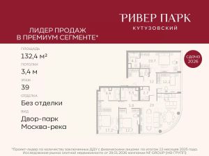 Продается 4-к квартира площадью 132.4 кв.м. на 39-м этаже в жилом комплексе премиум-класса Ривер Парк Кутузовский в Башне Янтарь