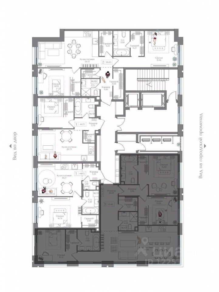 Внутренний двор 1,5 га функциональное и безопасное пространство для игр, работы и занятий спортом. Пешеходный променад для прогулок. Дома переменной этажности. Есть подземный паркинг.