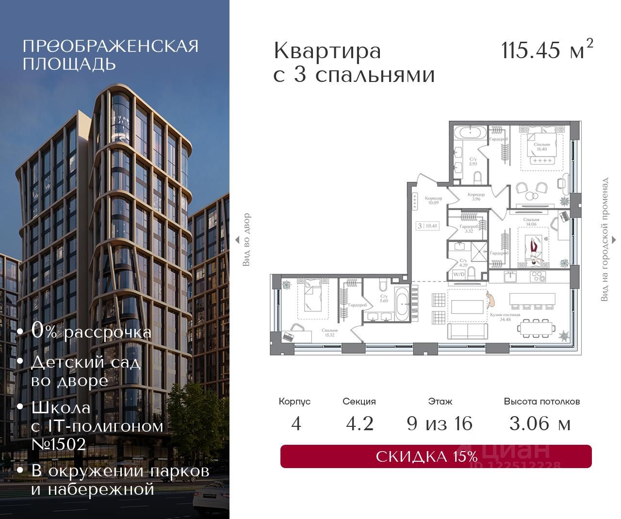Квартира на 9 этаже в жилом комплексе премиум-класса "Преображенская площадь". Общая площадь: 115.45 кв.м.