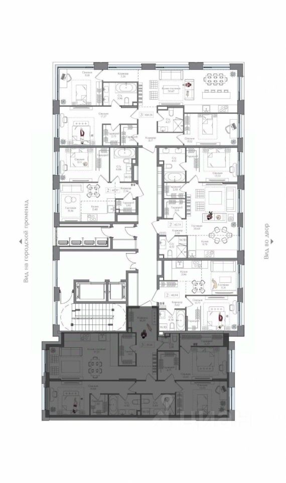 Внутренний двор 1,5 га функциональное и безопасное пространство для игр, работы и занятий спортом. Пешеходный променад для прогулок. Дома переменной этажности. Есть подземный паркинг.