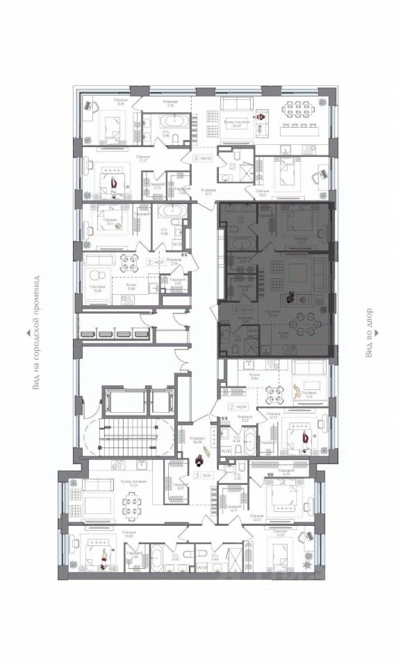 Внутренний двор 1,5 га функциональное и безопасное пространство для игр, работы и занятий спортом. Пешеходный променад для прогулок. Дома переменной этажности. Есть подземный паркинг.