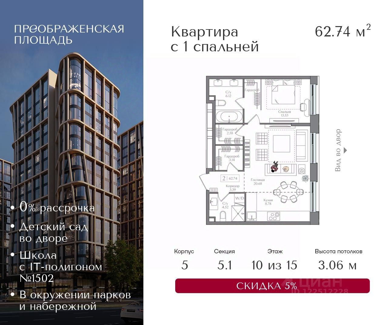 Квартира на 10 этаже в жилом комплексе премиум-класса "Преображенская площадь". Общая площадь: 62.74 кв.м.