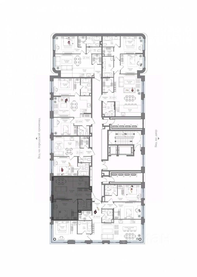 Внутренний двор 1,5 га функциональное и безопасное пространство для игр, работы и занятий спортом. Пешеходный променад для прогулок. Дома переменной этажности. Есть подземный паркинг.