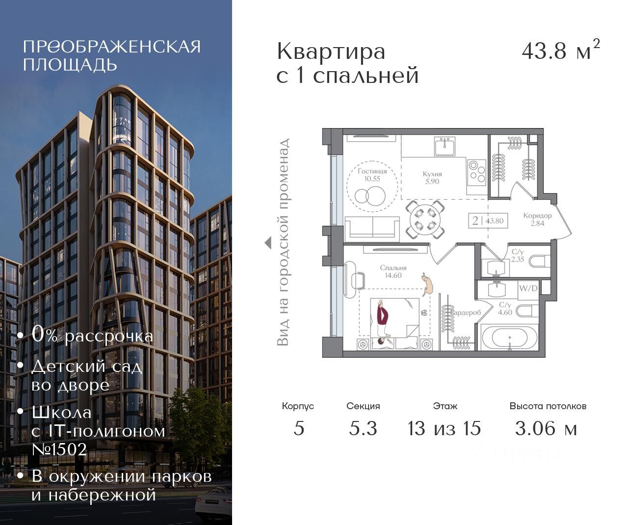 Квартира на 13 этаже в жилом комплексе премиум-класса "Преображенская площадь". Общая площадь: 43.8 кв.м.