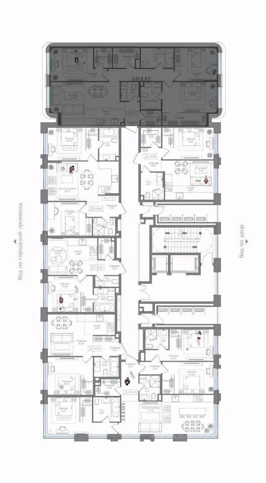 Внутренний двор 1,5 га функциональное и безопасное пространство для игр, работы и занятий спортом. Пешеходный променад для прогулок. Дома переменной этажности. Есть подземный паркинг.