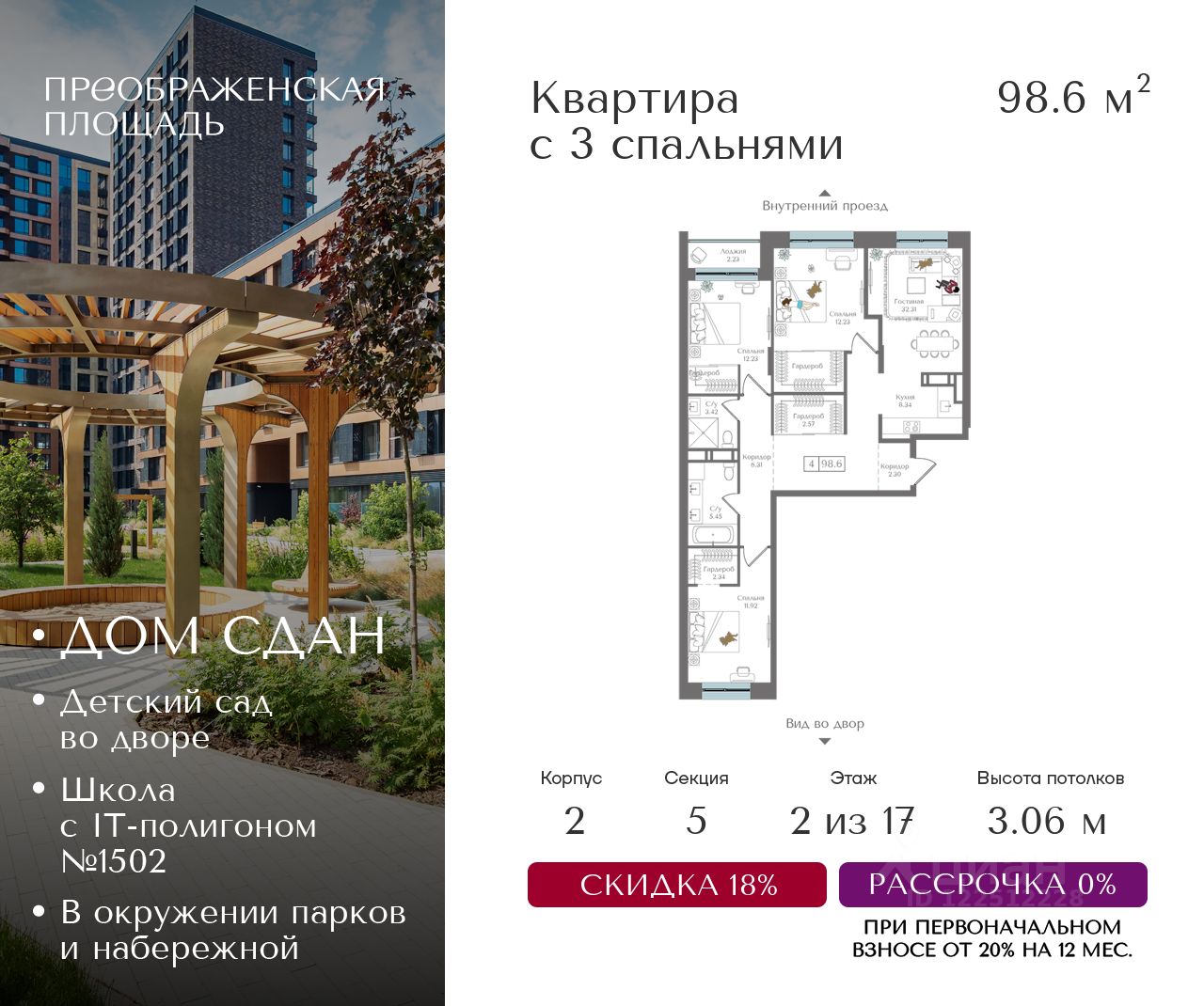 Квартира на 2 этаже в жилом комплексе премиум-класса "Преображенская площадь". Общая площадь: 98.6 кв.м.