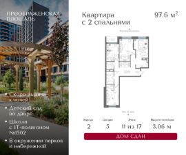 Квартира на 11 этаже в жилом комплексе премиум-класса "Преображенская площадь". Общая площадь: 97.6 кв.м.