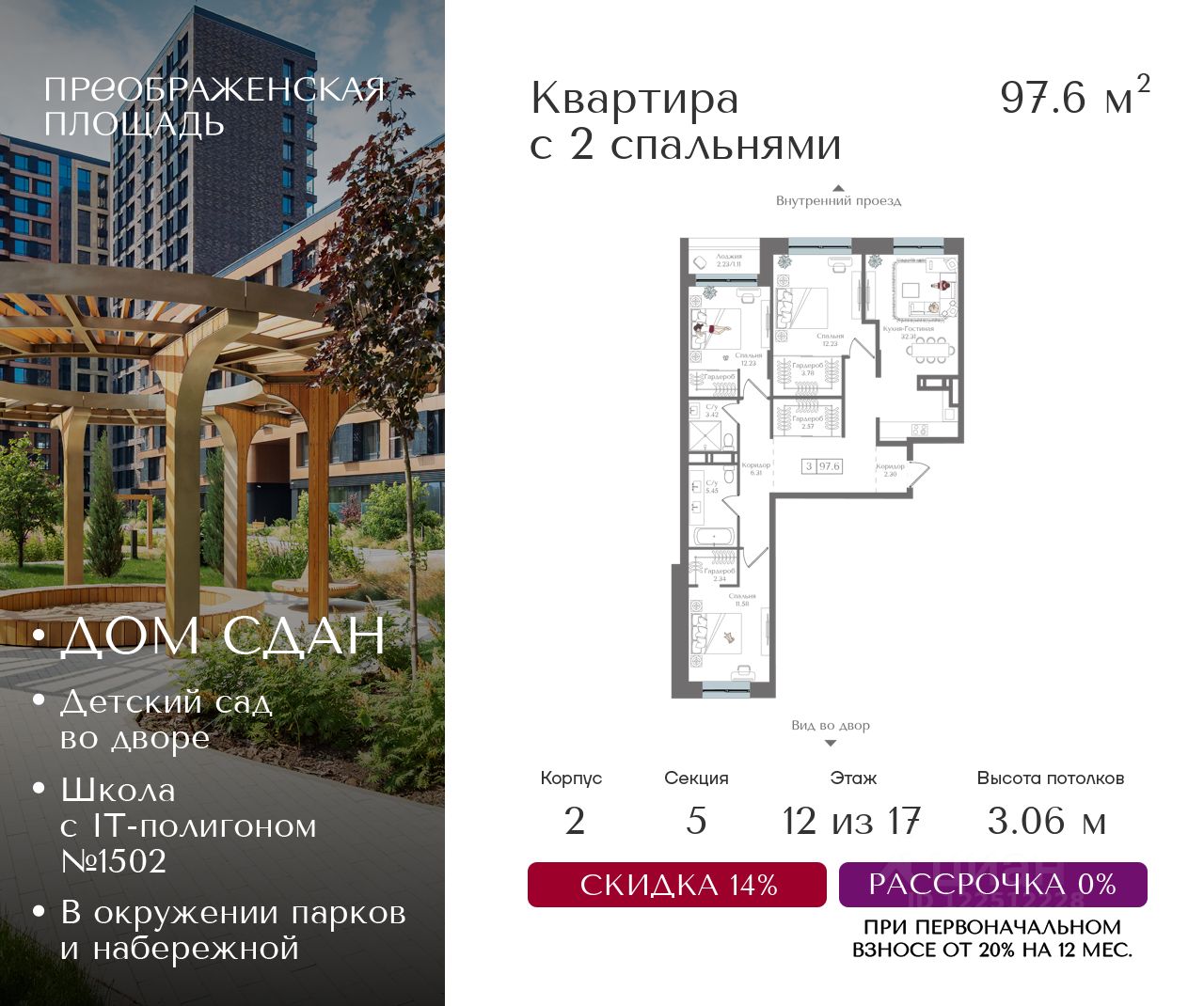 Рассрочка 0% от застройщика. Первоначальный взнос от 20%. Предложение действует до 31 декабря 2025 года